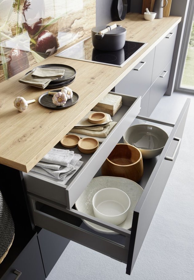 Eine Inselküche bietet Ihnen zusätzlich praktischen Stauraum. In den geräumigen Schubladen können Sie zum Beispiel optimal Ihre Töpfe und Salatschüsseln lagern.